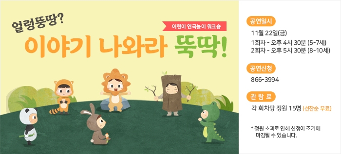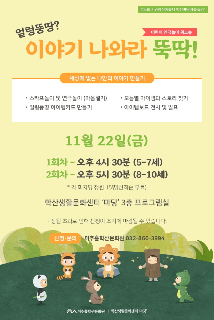[학산마당예술놀래 만의 워크숍: 어린이 연극놀이] 얼렁뚱땅? 이야기 나와라 뚝딱! admin 0 9103 2019-11-09 10:50:11 이전글 : 추억의 그때로 빠져보자! 다음글 : [전문마당극과 놀래? - 돌아온 약장수] 목록 댓글목록 이름 비밀번호 등록