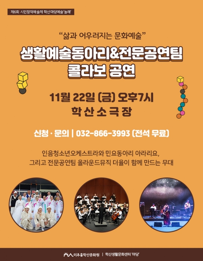 [콜라보공연 과 함께 놀래?-삶과 어우러지는 문화예술] 생활예술동아리 와 전문공연팀이 뭉쳤다! admin 0 8603 2019-11-21 15:47:42 이전글 : [마당예술동아리와 놀래? - 제 3탄: 미추홀 물길, 엎어라 뒤집어라! ] 다음글 : 삶의 기억과 그리움을 전시하다 목록 댓글목록 이름 비밀번호 등록