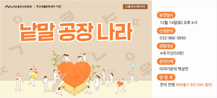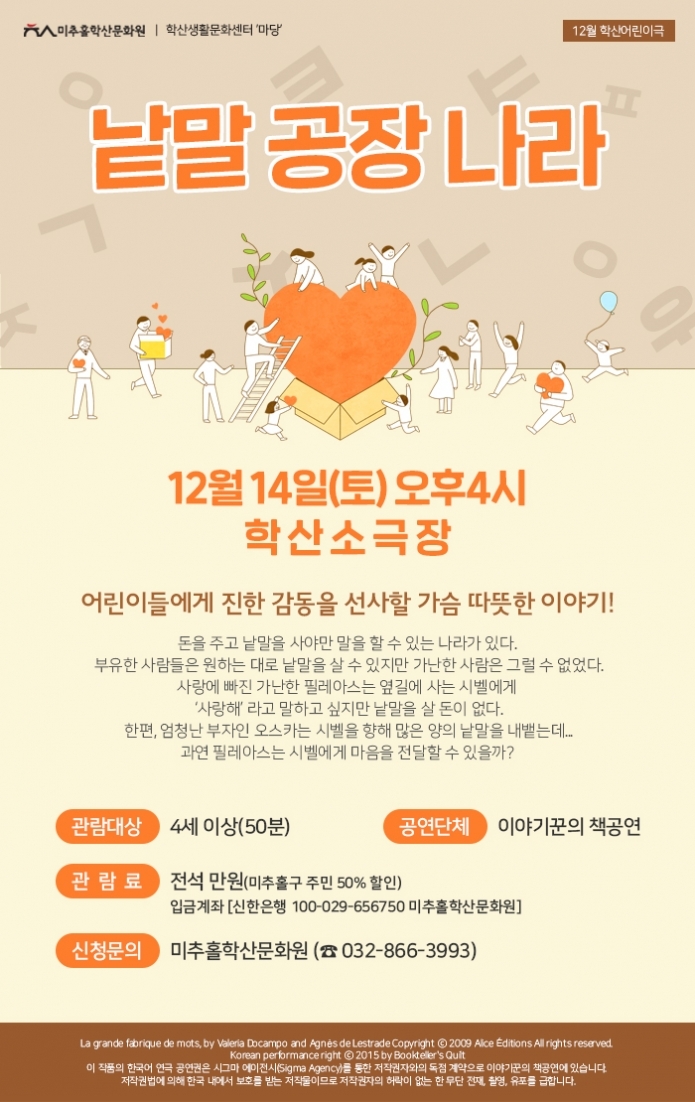 12월 학산어린이극 연극 <낱말 공장 나라> 박수빈 0 8952 2019-11-28 17:47:19 이전글 : 11월 학산가족음악회 공연 다음글 : 2019년 시민창작예술제 학산마당예술 '놀래' 축제 목록 댓글목록 이름 비밀번호 등록
