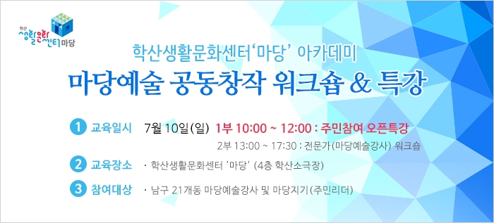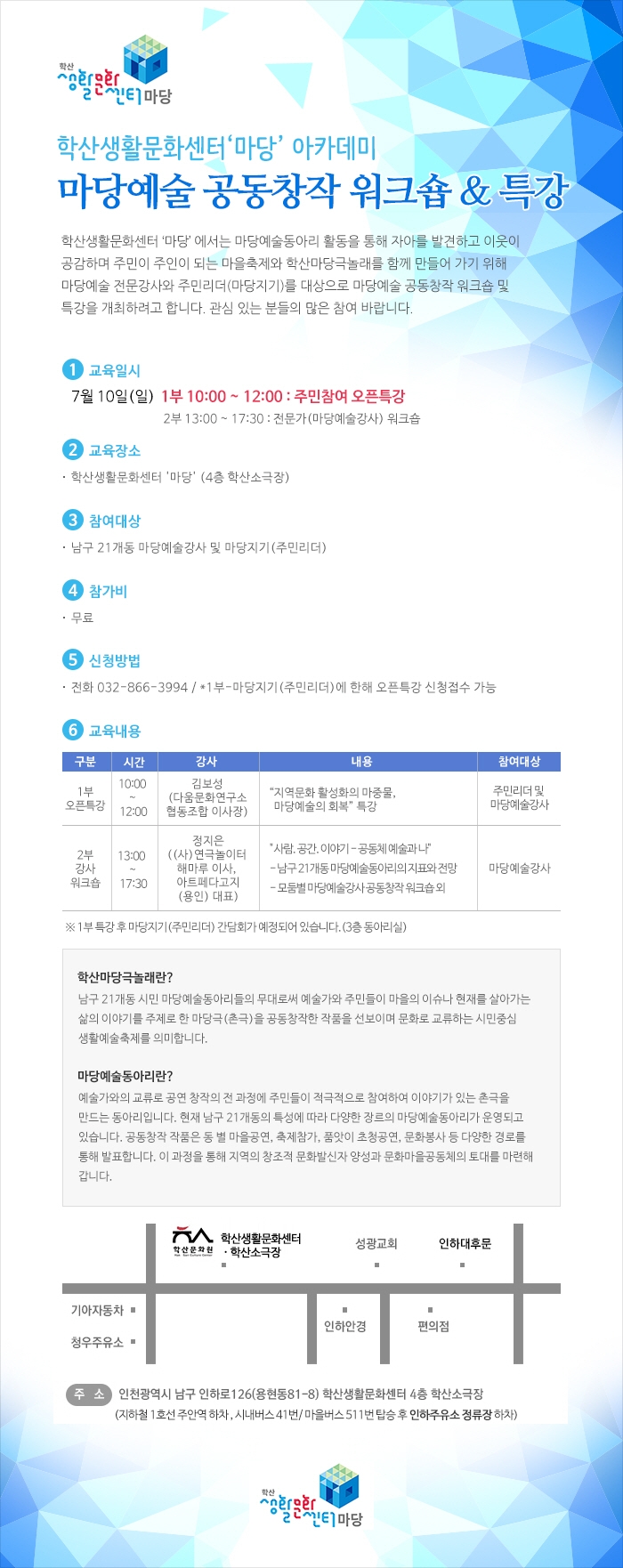마당예술 공동창작 워크숍 & 특강 마당예술강사와 마당지기가 함께하는 '마당' 아카데미 학산 0 10036 2016-07-05 20:08:05 이전글 : 주안6동 '풍성한 앙상블', 정다운 주민들이 만드는 풍성한 하모니 다음글 : 야(夜)심한 연극반 참여자 모집 목록 댓글목록 이름 비밀번호 등록