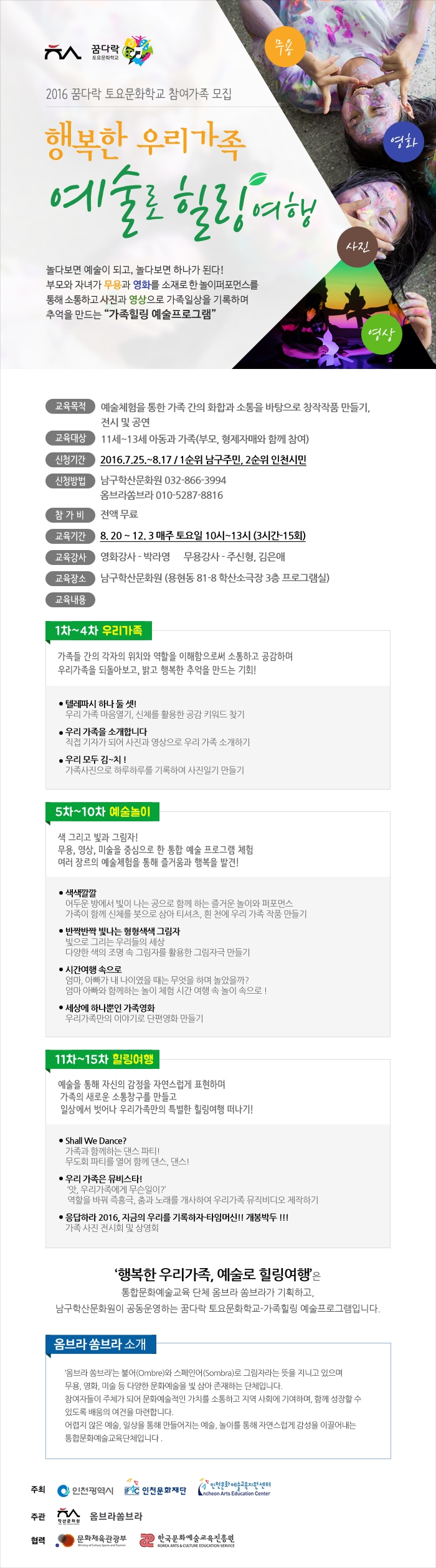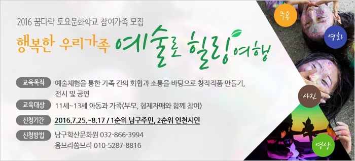 행복한 우리가족 예술로 힐링여행! 2기 참여자 모집 이번에는 초등학교 고학년 어린이와 함께 sheep 0 8668 2016-08-03 15:44:29 이전글 : [매월 마지막 주 수요일 - 문화가 있는날] 7월 영화감상 프로그램 다음글 : 8월 하품학교 ' 와일드' 목록 댓글목록 이름 비밀번호 등록