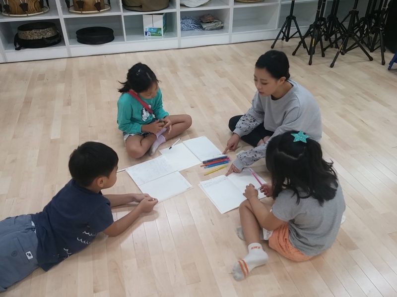 오늘 수업은 "여름," "바다", "가을" 이라는 주제를 갖고 3팀으로 나누어 “산도깨비” 노래로 가사창작하여 불러보고, 가사에 맞는 그림도 그려보고 ~~~