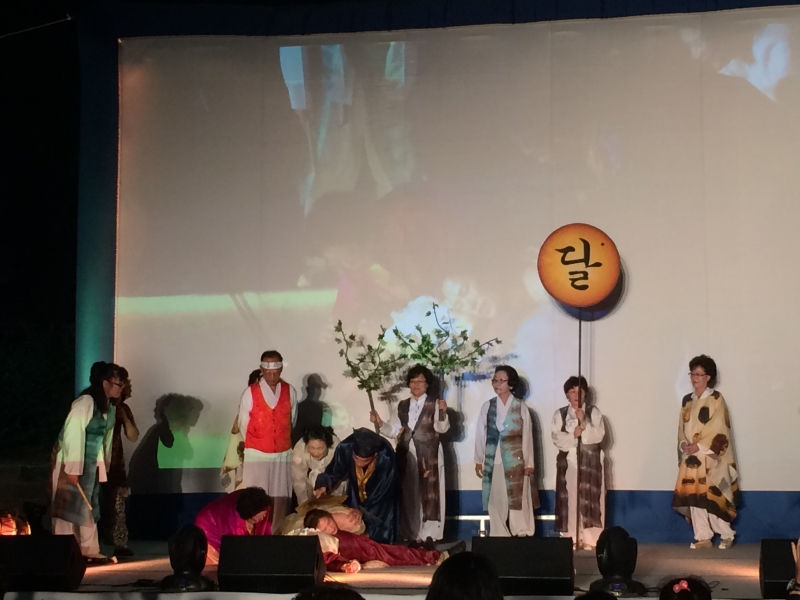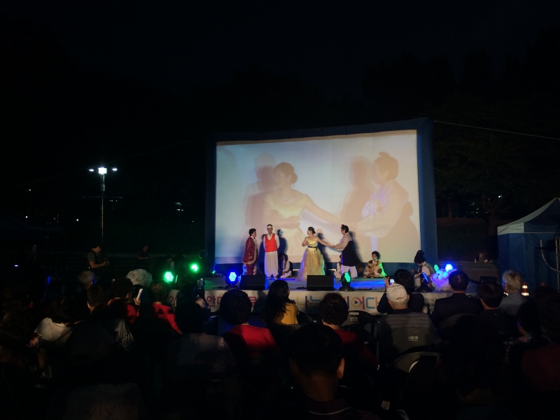 셰익스피어의 로미오와 줄릿엣은 주인공의 죽음으로 새드엔딩이었지만 관교동 로미오와 줄리엣은 주인공들의 작전(?)이 성공으로 원수지간 두 집안도 화해하고 주인공들도 해피엔딩을 맞았답니다. 로미오(오도령)와 줄리엣(꽃분이)이 부모님을 화해시키기 위해 죽은 척 연기를 하는 장면에서는 관교동의 많은 관객들이 하얀 꽃을 흔들며 영혼결혼식도 함께 축하해 주시고, 같이 눈물을 흘려주셨다고 합니다. 성황리에 공연을 마친 관교동 로미오와 줄리엣 공연은 10월 1일 학산마당극놀래에서 다시 만나보실 수 있습니다 ~