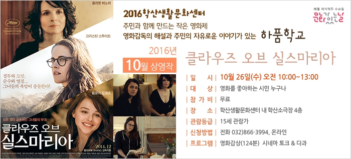 그녀들의 무대 이야기 ' 클라우즈 오브 실스마리아' 10월 26일, 작은영화제 하품학교 학산 0 8680 2016-10-05 14:51:05 이전글 : 세계로 떠나는 춤여행 "Dancing queen" 다음글 : 온 가족이 함께하는 특별한 시간 목록 댓글목록 이름 비밀번호 등록