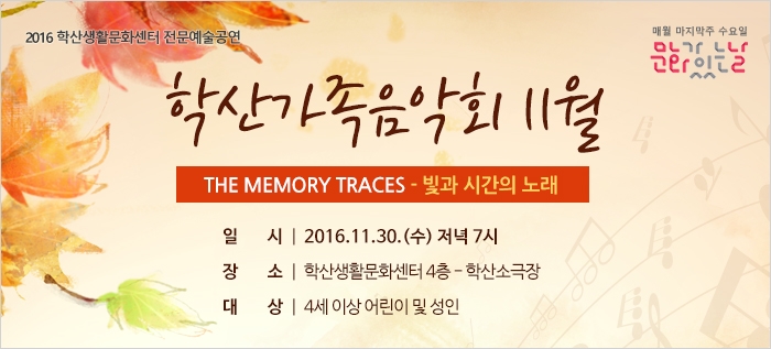 11월 학산가족음악회 - THE MEMORY TRACES 빛과 시간의 노래 admin 0 8291 2016-11-09 21:42:09 이전글 : 달콤살벌한 디저트 봄봄 참여자 모집 다음글 : 11월 하품학교 - 마담프루스트의 비밀정원 목록 댓글목록 이름 비밀번호 등록