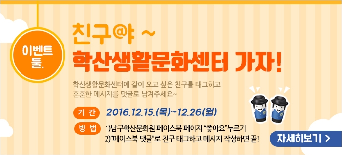 친구야 학산생활문화센터 가자! 문화원 페이스북에 친구와 함께 좋아요! 학산 0 8558 2016-12-21 15:49:21 친구들과 함께 학산생활문화센터 페이스북을 방문하여 주세요! 아래 이미지 링크를 클릭하여 주세요! 이전글 : 학산생활문화센터 참여후기 이벤트 다음글 : 주민들의 작품들이 가득 '생활전시' 목록 댓글목록 이름 비밀번호 등록
