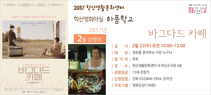 황량한 사막에서의 아름다운 뮤직 바이블 2월 하품학교 '바그다드 카페' 상영 학산 0 9470 2017-02-14 16:38:14 이전글 : 2017년에도 시민문화예술공동체가 어우러지는 지역문화를 만들어 가겠습니다 다음글 : 한결과 함께 한 해의 복을 불러오는 '지신밟기' 목록 댓글목록 이름 비밀번호 등록