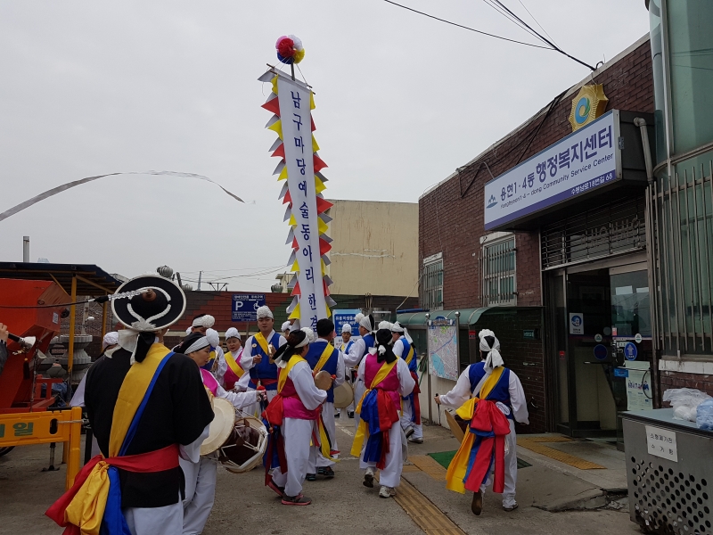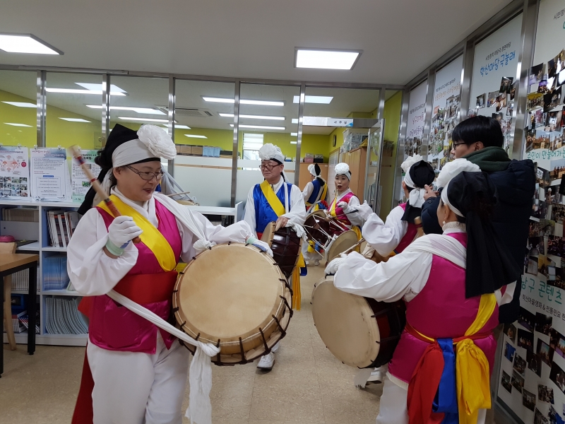 '한결'의 활동무대인 학산생활문화센터'마당'을 시작으로 용현1,4동 거리, 새마을금고, 주민센터, 우리동네 가게, 우리 동아리 집집을 다니며 곳곳마다 흥겨운 풍물장단으로 나쁜 기운을 물리치고 좋은 복을 가득 불러옵니다~