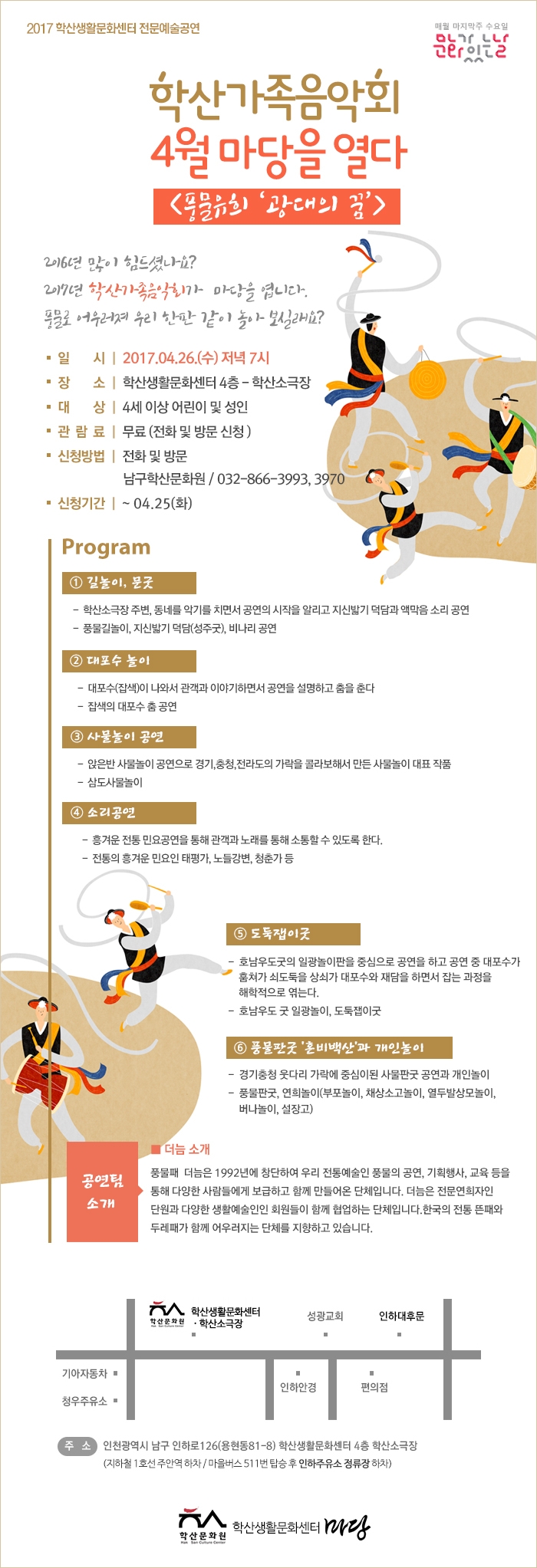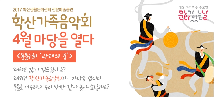 학산가족음악회 4월 마당을 열다 <풍물유희 ‘광대의 꿈’> admin 0 8655 2017-04-25 10:19:24 이전글 : 신나는 탈춤과 함께하는 참여 어린이 모집 다음글 : “당신의 노래를 만들어 드립니다” 목록 댓글목록 이름 비밀번호 등록