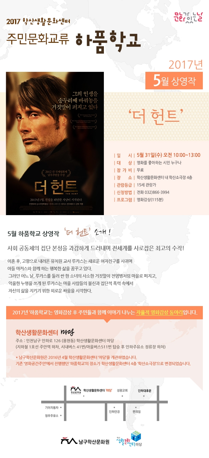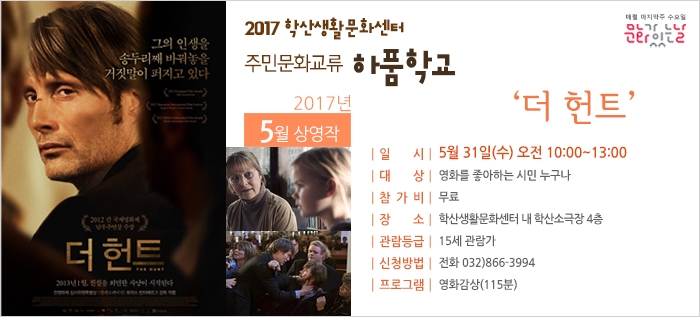 주민문화교류 하품학교 5월상영작 ‘더 헌트’ admin 0 9608 2017-05-15 17:01:15 이전글 : 5월 학산가족음악회 ‘풍물 is 뭔들 Good' 다음글 : 도화2.3동 마당예술동아리 ‘어수선’한 첫 만남! 목록 댓글목록 이름 비밀번호 등록