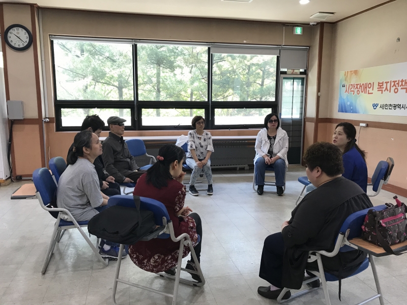 2018년6월20일 햇살이 유난히 눈부시던 날... 학익1동에 위치한 시각장애인 복지관을 찾았다.오전10시부터 시작하는 '학산 마당예술 동아리 '마냥'의 수업과정을 기록하기위해 찾은 강당에 들어선 순간 담소하고계신