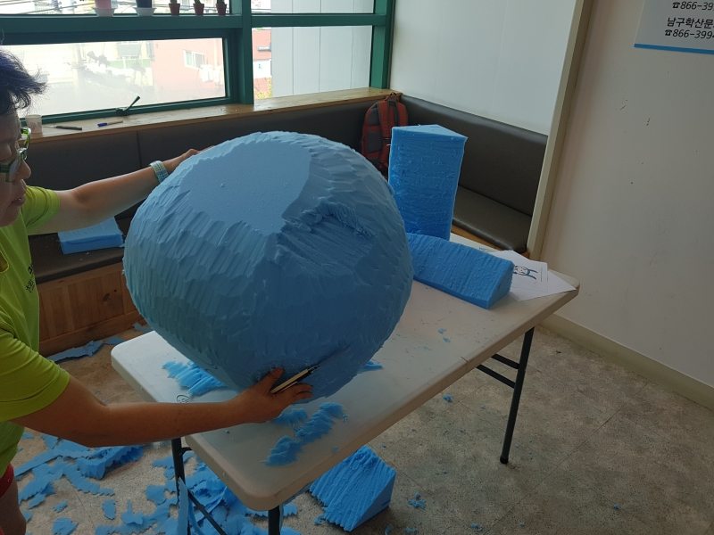 엄청 큰 스폰지를 전문 강사가 직접 슥삭슥삭 형태를 만들어 갑니다.