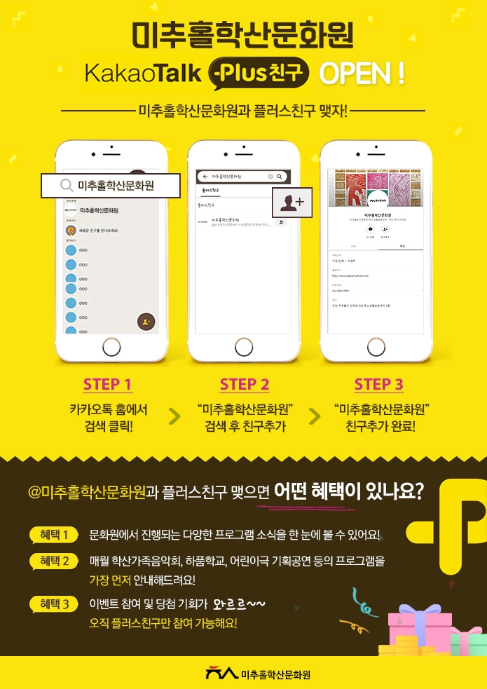 미추홀학산문화원 카카오톡 플러스친구 오픈 안내 미추홀학산문화원 0 10396 2018-09-17 15:07:56 미추홀학산문화원 공식 카카오톡 플러스친구가 오픈하였습니다. 앞으로도 다양한 문화예술소식을 전해드리기 위해 노력하는 미추홀학산문화원이 되겠습니다. 이전글 : 판그림으로 새기는 우리동네 - 주안7동 다음글 : 학익1동 '마냥' - 3 목록 댓글목록 이름 비밀번호 등록