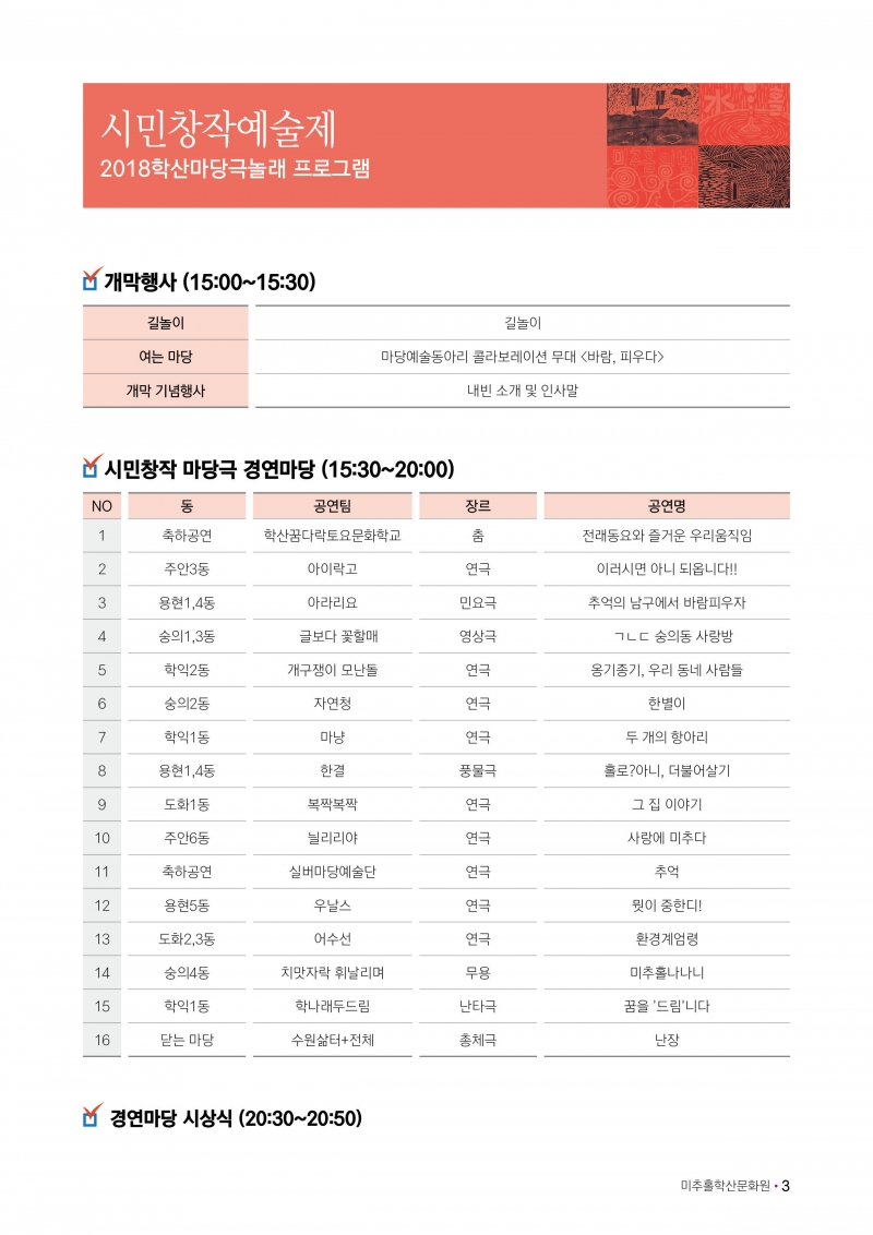 이번 창작예술제 경연마당 심사는 전문가와 60여명의 주민심사단이 참여해 진행한다. 작품상과 마당상, 공동창작상, 놀래상, 주민심사상 등 참가자 전원에게 그동안의 노고를 위로하는 상이 주어진다.