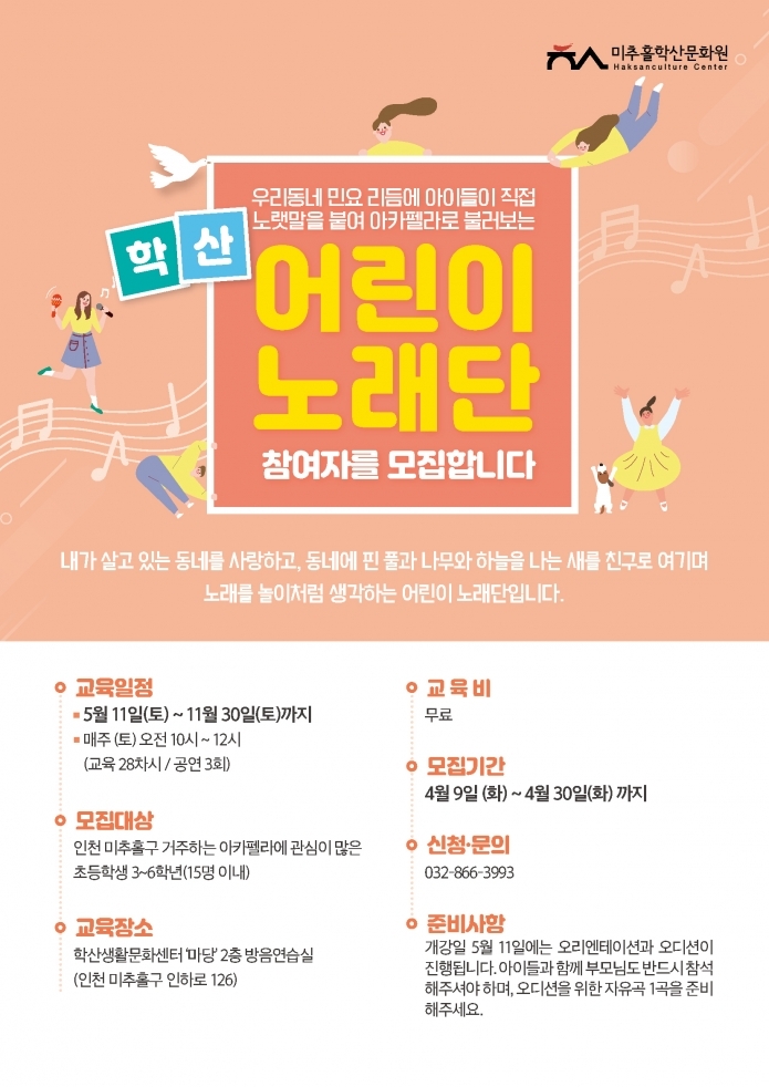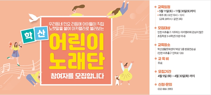 어린이 노래단 참여자 모집 - 노래를 좋아하는 어린이하면 누구나 참여가능 학산생활문화센터 0 10590 2019-04-23 10:19:23 이전글 : 학산생활문화센터 시민극단 참여자 모집 다음글 : 물이 많아 물이 흘렀던 미추홀구…승기천 본류 찾기 목록 댓글목록 이름 비밀번호 등록