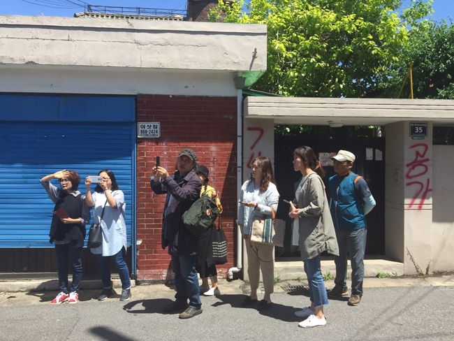 아카이브(기록 보관)프로젝트 참가자들이 주안3동 재개발예정지를 답사하고 있다.