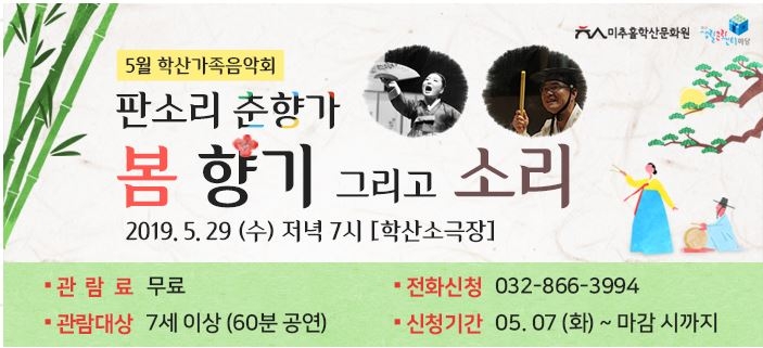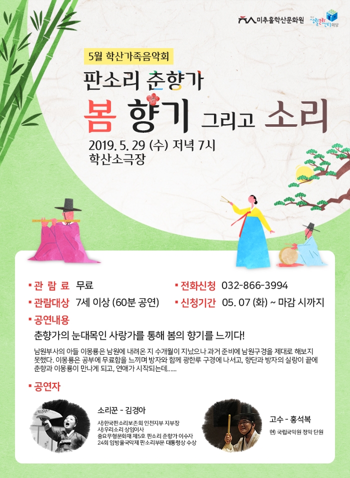 2019 학산가족음악회 5월 공연 판소리 춘향가 \'봄 향기 그리고 소리\' 학산생활문화센터 0 9914 2019-05-25 19:29:36 0507_5월가족음악회.jpg 이전글 : 2019 상주단체 레파토리공연 다음글 : 2019 학산 어린이극 6월 공연 목록 댓글목록 이름 비밀번호 등록