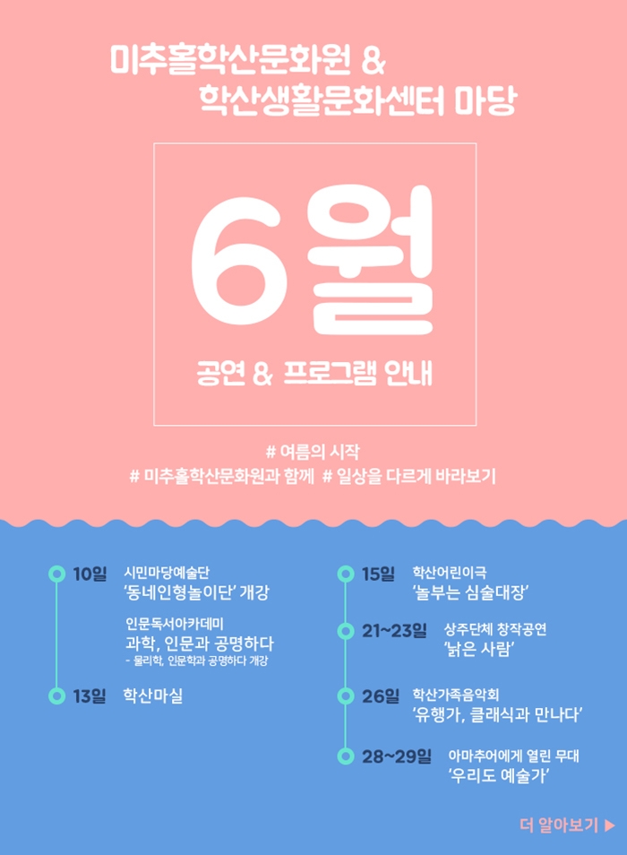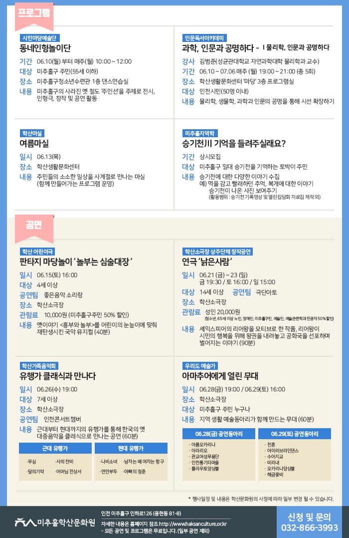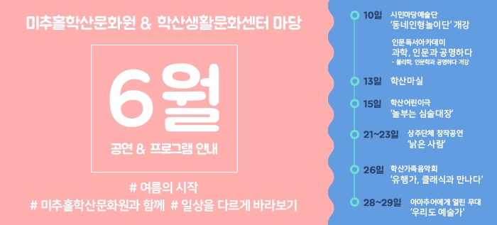 6월 공연·프로그램 안내 미추홀학산문화원 0 10800 2019-05-31 10:45:31 이전글 : 5월 학산가족음악회 공연 다음글 : <동네> 살아지다 목록 댓글목록 이름 비밀번호 등록