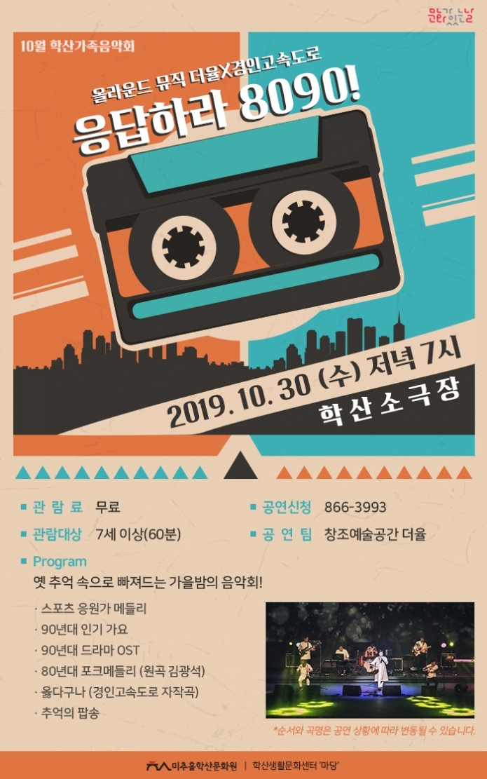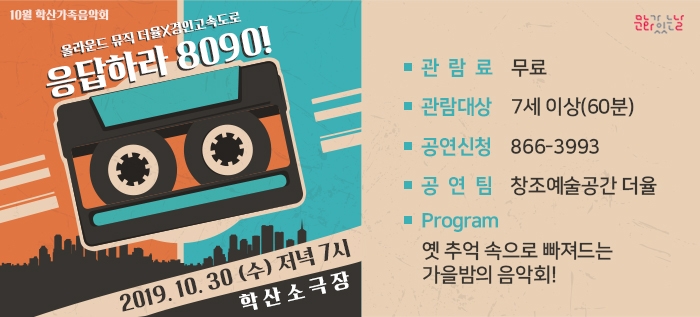 10월 학산가족음악회 <응답하라 8090!> 박수빈 0 9194 2019-10-22 15:11:07 이전글 : 10월 시민에게 열린무대 다음글 : 10월 공연·프로그램 안내 목록 댓글목록 이름 비밀번호 등록