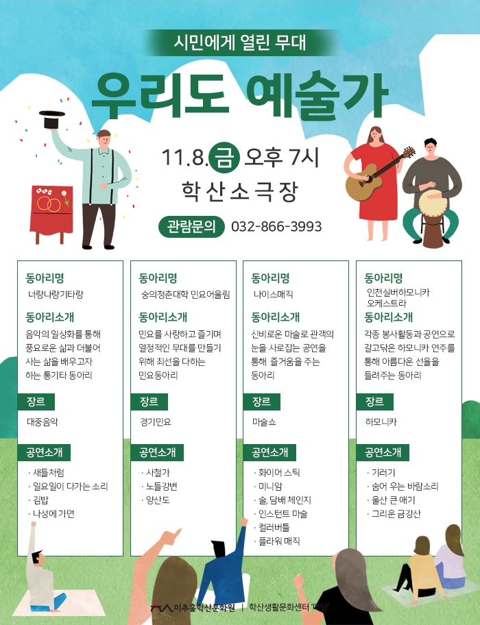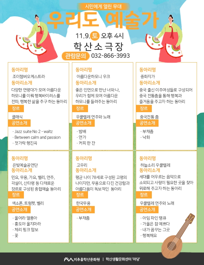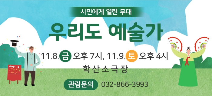 11월 우리도예술가 시민에게열린무대 박수빈 0 8632 2019-10-31 17:24:28 이전글 : 10월 학산가족음악회 공연 다음글 : 미추홀의 문화와 삶을 주민들이 직접 기록하다 목록 댓글목록 이름 비밀번호 등록