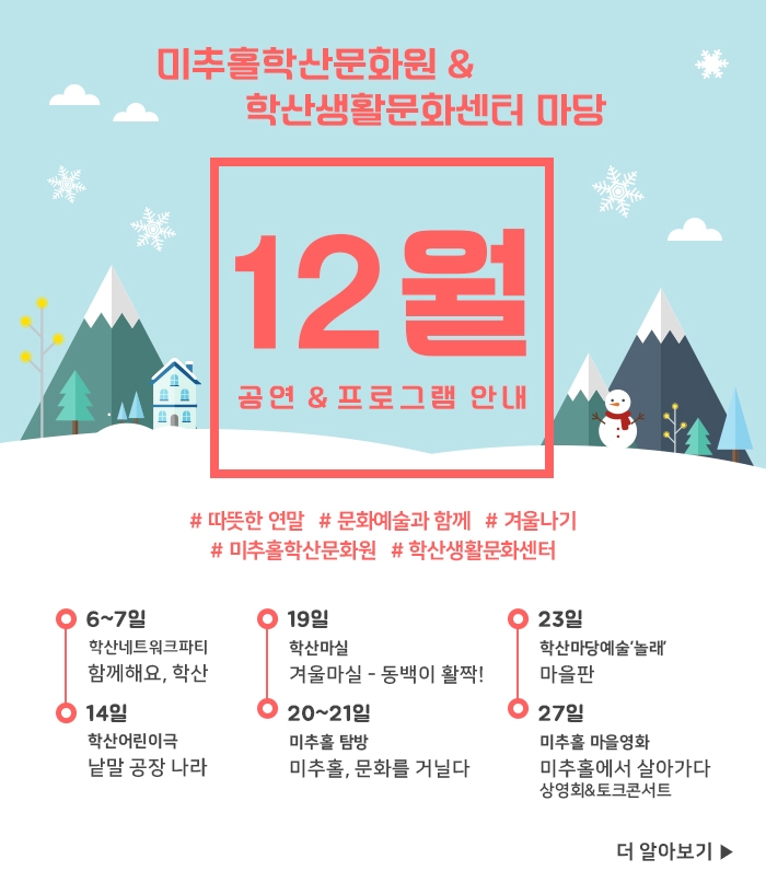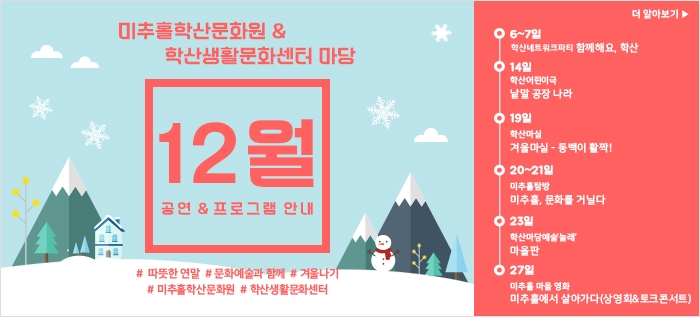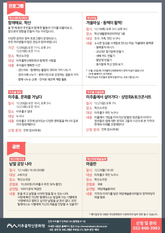 12월 공연·프로그램 안내 admin 0 9239 2019-11-30 09:07:40 이전글 : 즐길거리, 볼거리 풍성한 우리들의 축제! 다음글 : 미추홀 우리동네 이야기 창작 <미추홀 운전사> 공연 목록 댓글목록 이름 비밀번호 등록