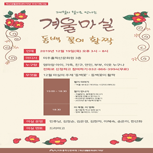 겨울 마실-동백 꽃이 활짝! 계절의 절기로 만나는 12월 마실 admin 0 8854 2019-12-10 17:36:27 이전글 : 학산 시민극단 연극<미추홀운전사> 다음글 : 우리 동네 탐방 \'기억의 주인선을 걷다\' 목록 댓글목록 이름 비밀번호 등록